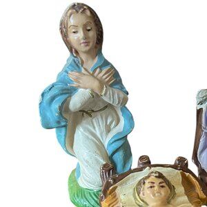 Beautiful vintage Italian plaster nativity set, likely from the 1950s, featuring Mary, Joseph, and Baby Jesus in the manger.