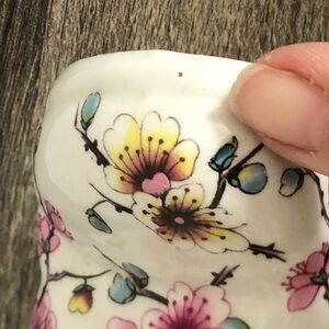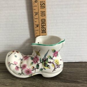 Charming collectible ceramic boot vase with pink floral design. Perfect for adding a touch of whimsy to any space. I believe the pattern name is Chinese Rose.