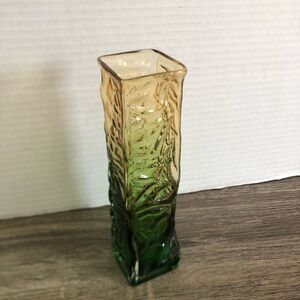 Elegant glass vase with a gradient of emerald green and amber. Perfect for a small bouquet of spring flowers. This funky art glass vase dates to the 60’s/70’s and is made in Japan by Tajima.
