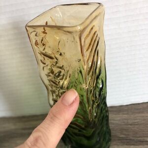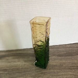 Elegant glass vase with a gradient of emerald green and amber. Perfect for a small bouquet of spring flowers. This funky art glass vase dates to the 60’s/70’s and is made in Japan by Tajima.