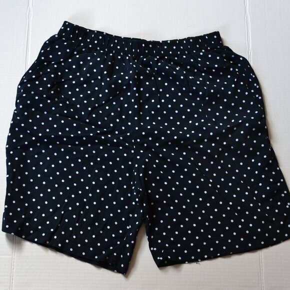 Short sleeved button up top with elastic waistband shorts. Super soft fabric, lightweight and very breathable. Black (or very very dark navy?) background with white polka dot pattern. Absolutely no material content tags or size tags (previously removed) so please see measurements below.