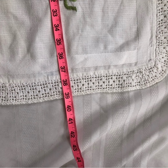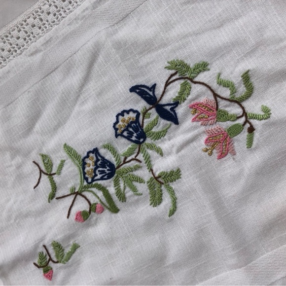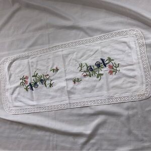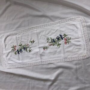 Lovely hand crafted table runner with floral embroidery. Features intricate lace edges. Perfect for adding charm to any table setting. Made by Jobelan in West Germany.