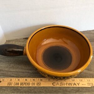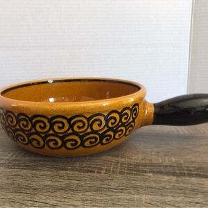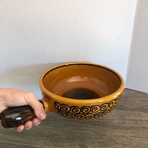 Elegant stoneware fondue pan with intricate design. Features a sturdy handle and classic shape. Perfect for cooking and serving. Made in Switzerland in the 1960’s based on my research.