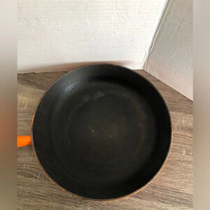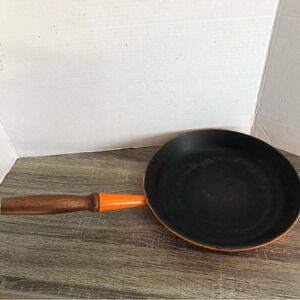 Very heavy duty cast frying pan. Made in France by Le Creuset. Orange colour on the bottom. Solid wood handle with a metal hook on the end should you need to hang this.