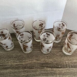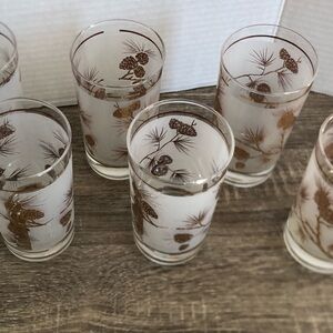 Set of seven tumbler glasses with a gold pinecone design. Perfect for adding a rustic touch to your tableware. Made by Libbey glass, unsure on exact date but likely mid twentieth century.