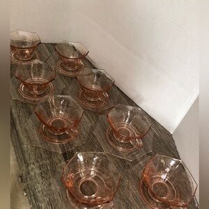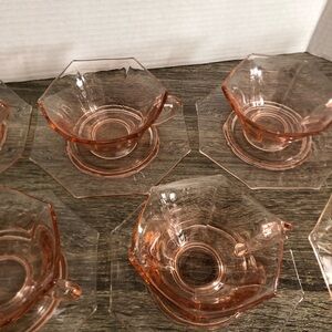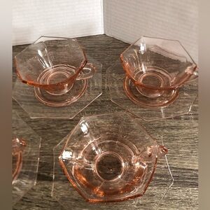 Elegant pink glass teacups with matching saucers. Perfect for tea parties or display. Depression glass made in the 1930s or so. Made by Liberty Glass Works, pattern name is Egg Harbor. Octagon shape.