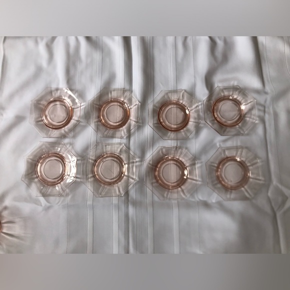 Elegant pink glass teacups with matching saucers. Perfect for tea parties or display. Depression glass made in the 1930s or so. Made by Liberty Glass Works, pattern name is Egg Harbor. Octagon shape.