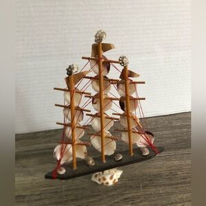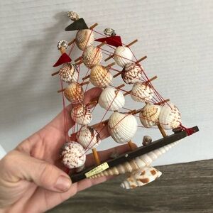 Adorable handmade sailboat. Made with seashells strung together and wood boat. Sails on the top finish the piece off. On the side of the boat is a label for Lunenburg Nova Scotia, so I presume this was a souvenir piece.