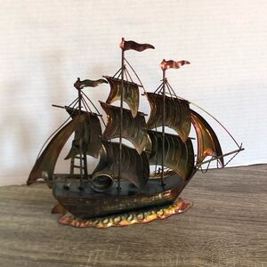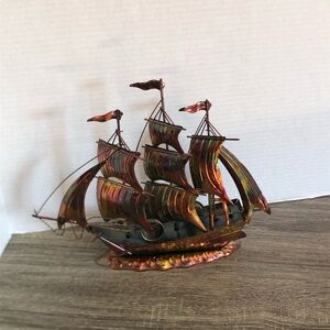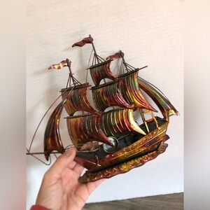 Beautiful decorative copper coloured metal ship sculpture with vibrant colours. Perfect for home decor. Made in the 60’s.