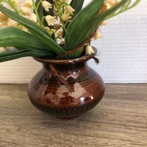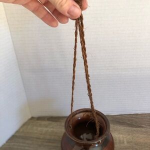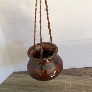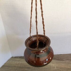 Ceramic brown hanging planter for indoors. Any flowers/ plants are enhanced by a rustic vine element, adding a natural charm to any space.