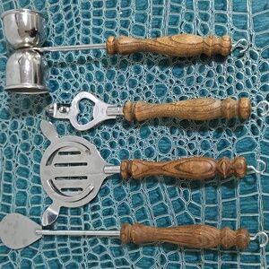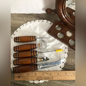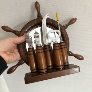 Nautical-themed bar tool set with a ship wheel design. Includes essential bar tools. Perfect for home bars. Made in Japan. Likely dates somewhere between the 1940’s and 60’s.