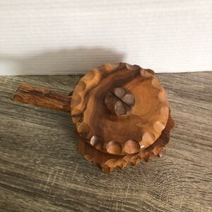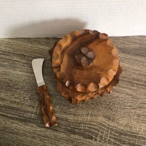 Solid wood made in Spain by Oliv-Art. Lovely mid-century modern covered butter dish with matching butter knife.