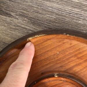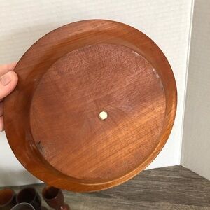 Lovely hand turned solid wood decanter and shot glass sized goblets, with a wood base that it all sits neatly on. Six shot goblets, one plate and one three piece decanter included.