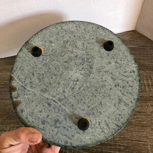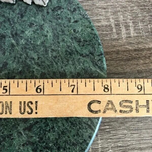 Green marble cheese board or trivet with grapes and leaves in metal. Can be used for multiple things. Feet on the bottom holds it up from the countertop.