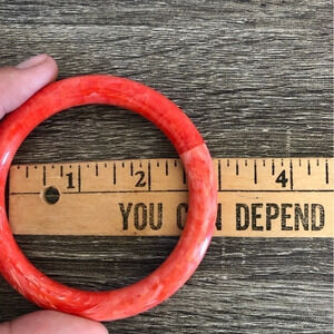 Coral red and white marbled bangle. I believe it is plastic but I am not an expert it could be something else. Likely from the 1980’s but again I am not an expert.