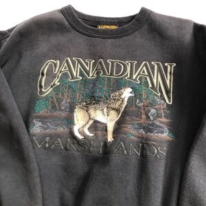 Stay warm and stylish with this Canadian made sweater. Perfect for any casual outing. Made by Marshlands Canada in the 90’s. Features an embroidered howling wolf with large spell out of Canadian above the wolf and Marshlands under the wolf. Size medium. Please see photos for measurements.