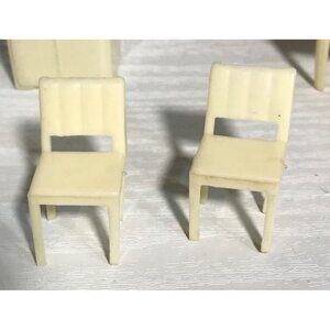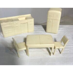 This vintage plastic dollhouse kitchen furniture set includes a refrigerator, stove, and dining table with chairs. Its compact size makes it suitable for dollhouses and miniature displays.