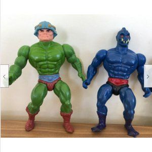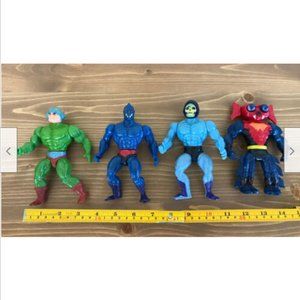 Set of 4 vintage Masters of the Universe 6" action figures includes 3 with soft heads from 1981: Skeletor, Webstor, and Man-at-Arms, and one from 1984: Mantenna (has soft gills/ears). Figures only; does not include any accessories. All figures are in "played with" condition and have scuffs/marks to plastic surface. Note that the back switch to move Mantenna's eyeballs is broken, and the paint is rubbed off most of the eyes.