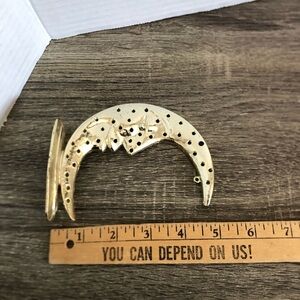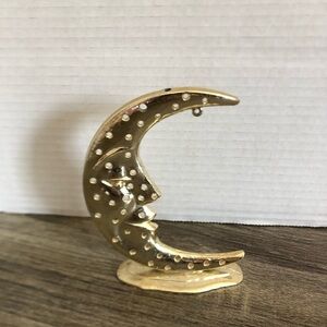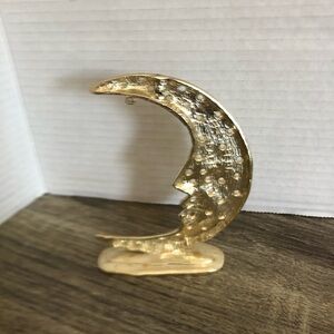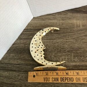 Elegant gold tone crescent moon earring stand with intricate details. Perfect for hanging and displaying earrings!