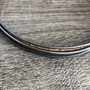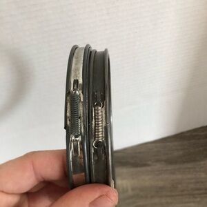 Lovely vintage metal two piece hoops with cork gasket to prevent slippage of the material while you are working. Unmarked so unsure on maker.