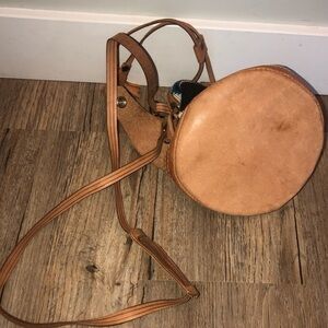 Vtg Mexican Leather Crochet Knit Crossbody Mini Bucket Bag Drawstring Button