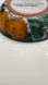 This is a vintage hand painted and hand signed Mexican Talavera Castillo 7.75" x 1.75" bowl. The bowl is painted with orange-yellow fruit and botanical theme. Rim is navy blue.
