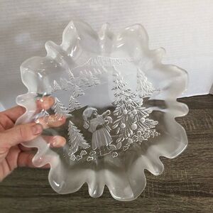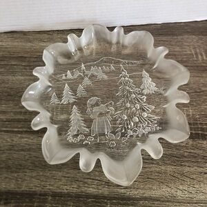 Elegant glass plate with a winter scene. Features a girl decorating trees. Perfect for display or gifting. Made by Mikasa. We have owned this plate since at least the 90’s.