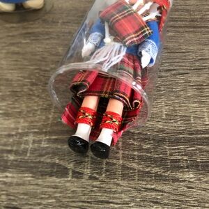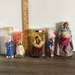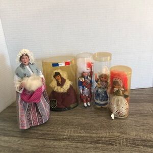 Explore this exquisite collection of dolls, featuring a boy dressed in Scottish attire; a little girl wearing an outfit from Holland; a little girl wearing a German outfit; a French miniature woman; and a larger handmade doll by Sylvette Amy in France.