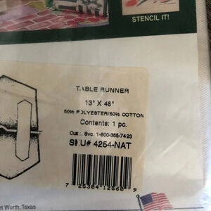 Decorate your own table runner (multiple suggestions shown) with this Ivory table runner. Or you can also use it as is. Dated 1995, still sealed in original package.