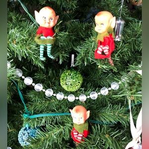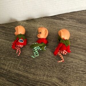 Set of three vintage elf ornaments. Features red and green outfits with striped stockings. Perfect for holiday decor. Made in Japan. Each measures approximately 3” knees tucked up.