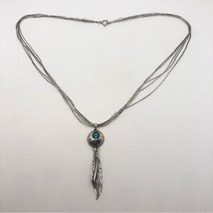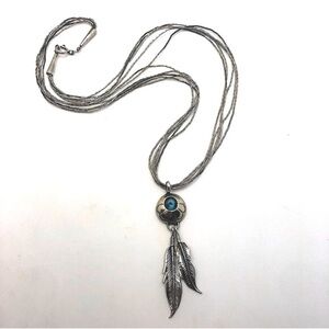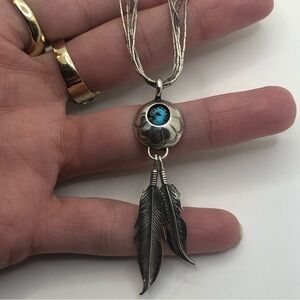 Vtg Navajo Sterling & Turquoise & Feather Pendant Liquid Silver Chain 20” + 2.5”
