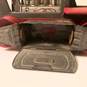 This tin toy does not work and is incomplete. It comes as is. It has a lot of wear and dents, marks, scratches. Its very beat up, the paint is chipped. Please see all photos for exact item.