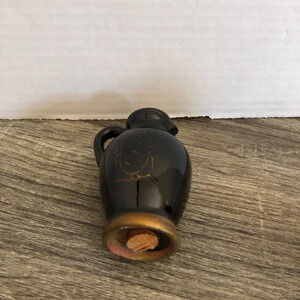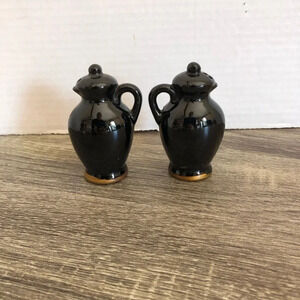Black little teapot shaped salt and pepper shakers. Redware ceramic with black paint and gold “s” & “p”. Both have the corks.