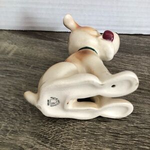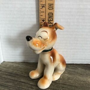 Delight in this charming tan and cream dog figurine, perfect for pet lovers. Its playful design adds a touch of whimsy to any space. Made in Occupied Japan.