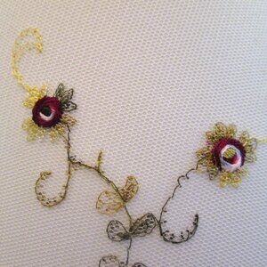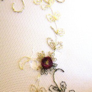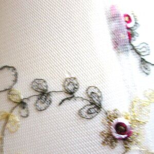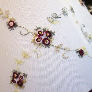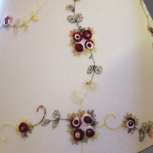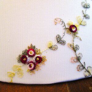 Vtg Embroidered pair of Off White lamp shades with spider hardware. Embroidery is delicate deep red with flower vines of greens beiges,grey and yellow. Lamp shades would be very nice for bedroom or living room spaces.There are two tiny spots of net that are thin. See in pictures last two. Believe they are on one lamp shade.