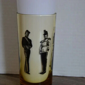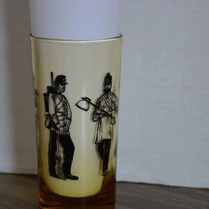 Two vintage amber glasses featuring "Old Fort Henry" pictorial images of soldiers.