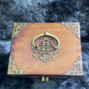 Elegant wooden jewelry box with intricate brass details. Features a rich brown finish and decorative brass accents. With lock and key. Very beautiful piece.