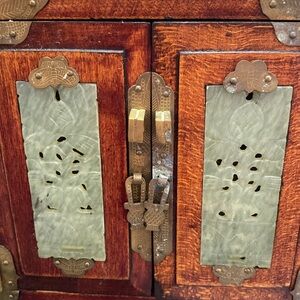 Vtg Oriental Wooden Jewelry Box Ornate Brass Carved Jade Inlaid w/ lock and key