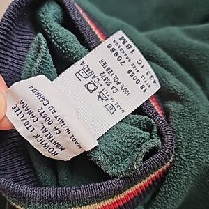 Vintage OshKosh B'Gosh Dark Green Fleece Sweater. Front has embroidered 'OKB OSHKOSH' with an earth / globe next to it. the neck and wrist cuffs are ribbed with a blue red & yellow striped pattern. back has buttons for closure. size 18 months
