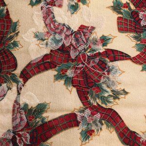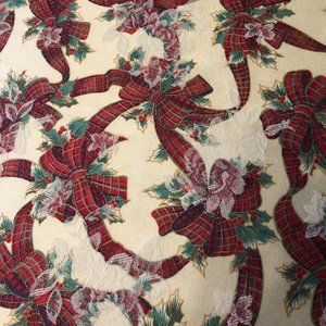 Vintage woven cream with bows tablecloth with white embroidered floral details - measures 82" x 58". Tie-up hanging kitchen towel with poinsettia design measures 13.5" tall. Non-smoking home.