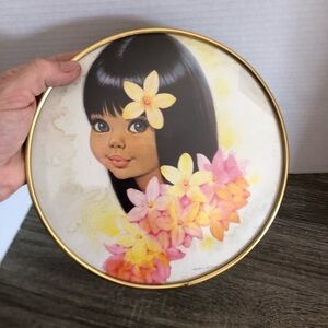 Charming art print featuring a girl with a flower in her hair. Surrounded by a lei of pink and yellow flowers. Perfect for adding a touch of vintage charm to any room. Made in the 50’s or 60’s likely. Original print is made by Owens. I believe this may be an original print as it does have all the indicators of an older piece. Convex glass is subtle but ads some depth to the print. Note: I think it’s glass, it may be plastic but it’s very hard to tell, I couldn’t see any scratching on it.