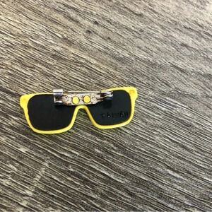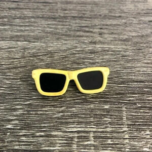 Adorable little vintage sunglasses brooches/pins. One pair of glasses is yellow, the other pink. Both have black lenses. All solid plastic (you can’t see through the lenses). Likely from the late 1980’s/early 1990’s. Marked on the back Taiwan.