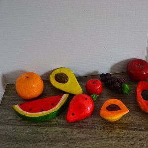 Bright rainbow of paper maché fruits/veggies. Listing includes all fruit pictured (10 total pieces) as well as a wicker basket to display them in.