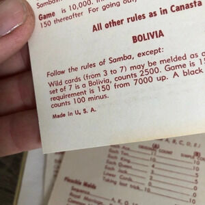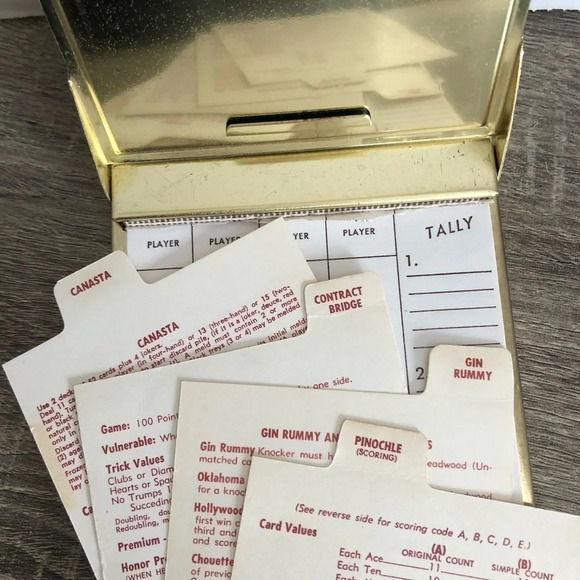 Includes cards with instructions on how to play a number of various card games. Some score cards missing as this is a pre-loved item and is not new. Very good condition for its age, likely dates to the 70s.