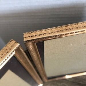 Showcase your cherished memories with this elegant gold triple picture frame. Its classic design adds a touch of sophistication to any room. Gold tone in colour but unsure of metal content. Lovely ornate design.