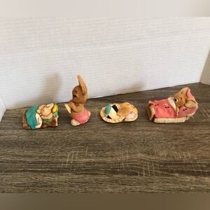 Delight in this charming set of bunny figurines, perfect for small pet lovers. Featuring adorable bunnies in pink, blue, and brown hues, these figurines add a whimsical touch to any space. Two have the original Pendelfin stickers on the bottom. Made in England from resin with felted bottoms.