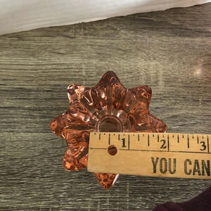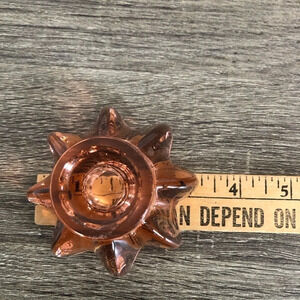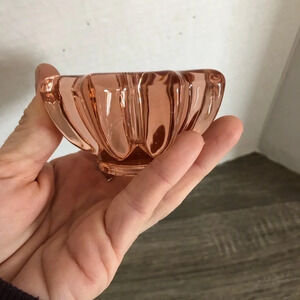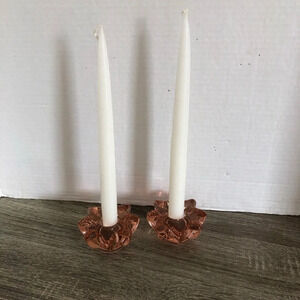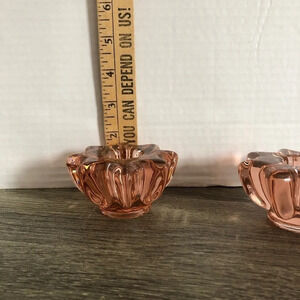 Gorgeous pink glass flower shaped candlestick holders. Vintage but I cannot determine a manufacturer. Very good condition no major chips or cracks, one is perfect, one has a couple of teeny flea bites along the bottom edge (see photo).