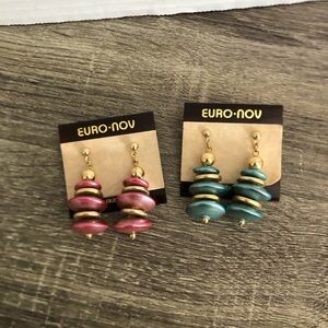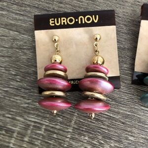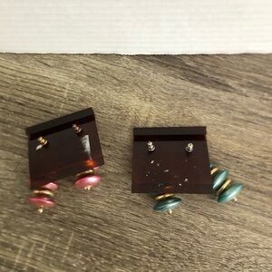 Add a pop of color to your outfit with these earrings. Featuring vibrant pink and blue hues, these earrings are perfect for any occasion. Stacked sort of ring style. Drop earrings. Pink and gold set and blue and gold set included. Likely date to the 80’s.