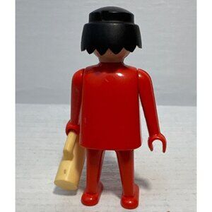 This vintage Playmobil figure, dated 1974, features a classic red outfit, black hair, and a yellow thermos accessory. A collectible piece for enthusiasts.