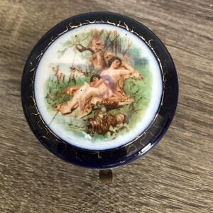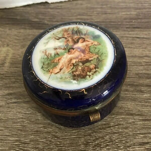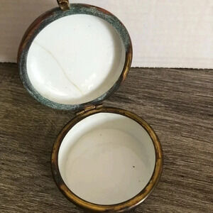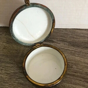 Fair condition- it does appear to have a hairline crack in the lid and there is some tarnishing on the metal edge but overall it still looks gorgeous and would make a wonderful addition to a vanity or other display shelf, or turn it into something new!